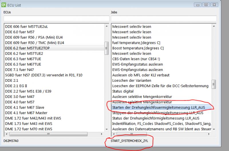 Näköjään tämmöinen jobi START_SYSTEMCHECK_ZYL pitää laittaa ajoon ennen sitä 'injector values #1':stä. Eli kaksi jobia ajoon tuo START_SYSTEMCHECK_ZYL ja sitten 'injector values #1'. Jos haluaa 'roughnessia' katsoa niin pitää laittaa vielä START_SYSTEMCHECK_ZYL:n job parametriksi:LLR_AUS