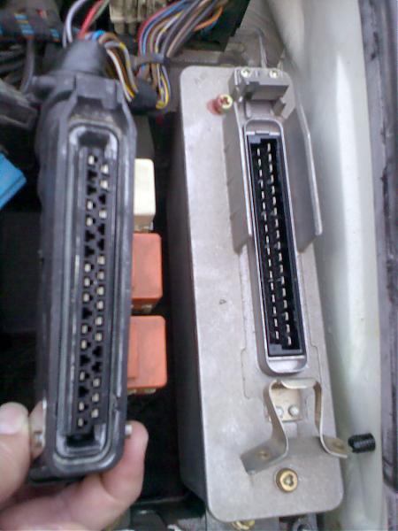 Motronic-boksi auki, ABS-laatikko ylös. lyhyemmässä rivissä on parittomalla numerolla ja pitkässä parillisella merkattuja pinnejä. pienin numero on lokasuojan puolella. vaihtoehtoisesti johtosarjan voi irroittaa ABS-laatikosta, jolloin näkee numerot suoraan.