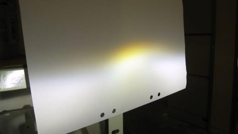 Ongelma on E39 orggis facelift xenon lyhdyn valokuvio jonka ylä reunassa keltaisen-ruskea alue, kts kuva joka otettu valkoista paperia vasten alle metrin etäisyydellä autosta.