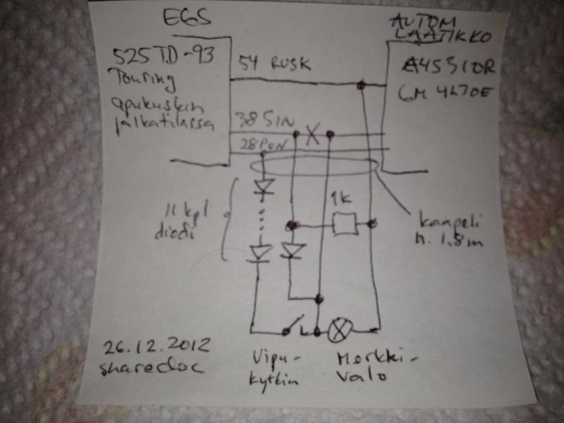 Täytyy kokeilla seuraavaksi kytkentää jossa EGS-boksin lähtö lockup clutchille eristetään ylösvetovastuksella ja diodilla, jolloin EGS ei huomaa kun lockup clutchia pakko-ohjataan. Lisäksi kokeilen pakko-ohjausta suoraan erillisellä vipukytkimellä vaihdelaation solenoidien maata vasten.
