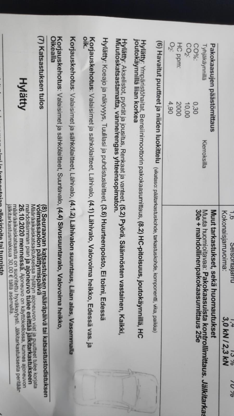 Pakokaasupäästöt liian korkealla, katsastuspäätös: HYLÄTTY/HYVÄKSYTTY II