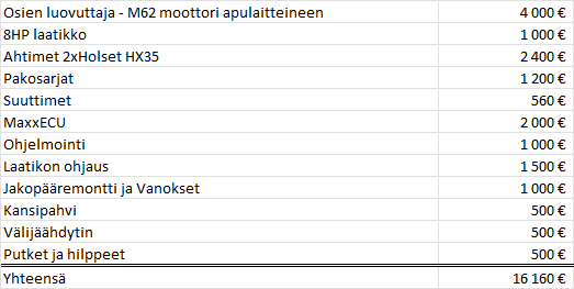 Kiitos myös erittäin hyvästä erittelystä mitä muutoksia tarvittaisiin tuon M62 osalta. Tein tuon pohjalta hieman budjettia ja on aika ilmeistä ettei alle 15k€ pärjää, vaikkei ostaisikaan mäntiä ja putkittaisi konetta...Elinten luovuttaja - M62 moottori apulaitteineen 4 000 € 8HP laatikko 1 000 € Ahtimet 2 kpl 2 400 € Pakosarjat 1 200 € Suuttimet 560 € MaxxECU 2 000 € Ohjelmointi 1 000 € Laatikon ohjaus 1 500 € Jakopääremontti ja Vanokset 1 000 € Kansipahvit 500 € Välijäähdytin 500 € Putket ja hilppeet 500 € Yhteensä 16 160 €