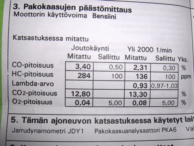 CO oli tyhjäkäynnillä 3.4% ja yli 2000rpm 2.31% sallitun ollessa 0.5% ja 0.3%.
