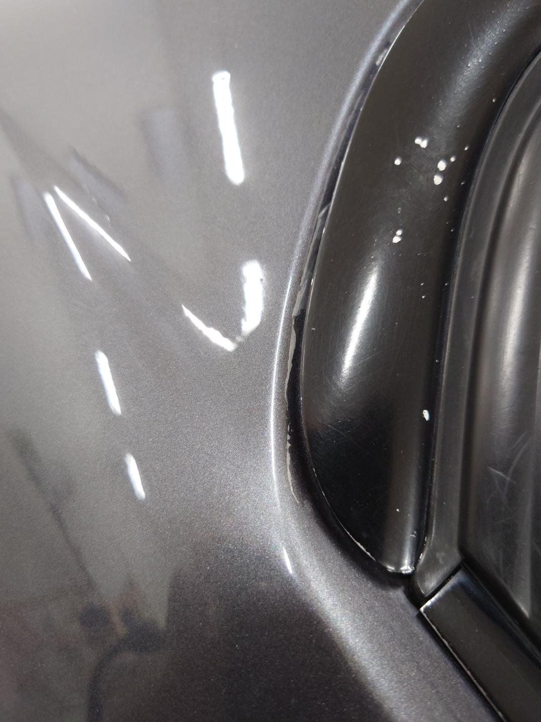 Normaalia jälkeä vanhan maalauksen jäljiltä, lista teipattu piiloon, maalia ja lakkaa mennyt hiomattomalle alueelle ja ennemmin taikka myöhemmin tuolta puoliksi piilosta olevasta reunasta hilseilee irti. Luultavasti ei mitään korvata kun vanha kärry ja näyttelymaalausta ei näihin muutenkaan vakuutusyhtiö suostu korvaamaan.