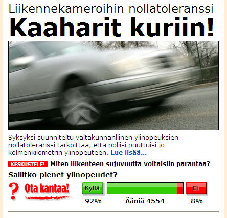 Omasta mielestä liikenteen turvallisuus lähtee ihmisten asenteista eikä liiallisesta valvonnasta. Se että ajetaan jonossa metri edellisen puskurista, pidetään nenä kiinni siinä nopeusmittarissa ettei vain lipsahda yhtään yli ja nostetaan sormi pystyyn heti jos kukaan ajaa yhtään nopeusrajoitusten yli on aika kehnoa liikenteen turvallisuuden parantamista. Itse näkisin paljon turvallisemmaksi sen että ihmiset oppisivat ensinnäkin ajamaan kunnon välillä siihen seuraavaan. Muiden huomiointi liikenteessä on suomessa todella heikkoa, lähinnä oikein kiusalla halutaan kiihdytää ja tukkia oma kaista jos joku toinen on eteen vaihtamassa kaistaa jne.